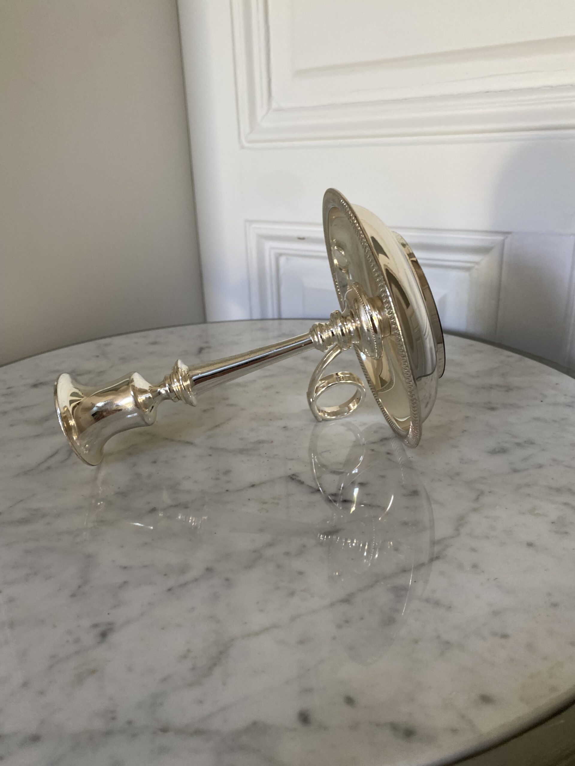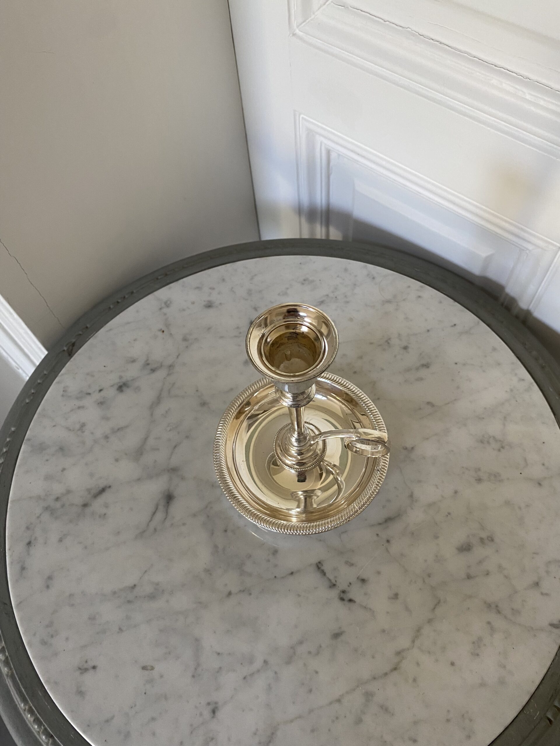 Bougeoir ancien en métal argenté avec bobèche et anneau