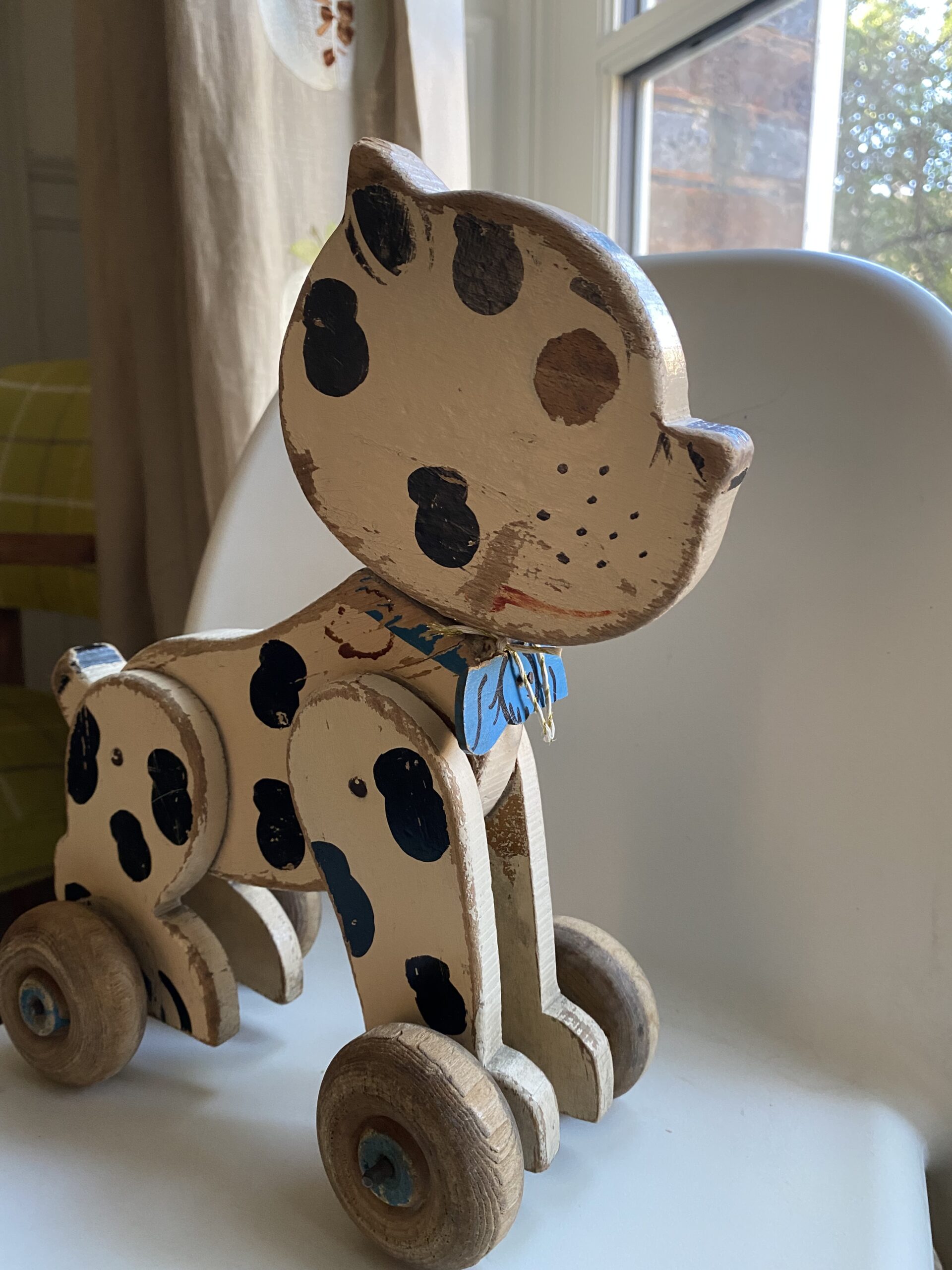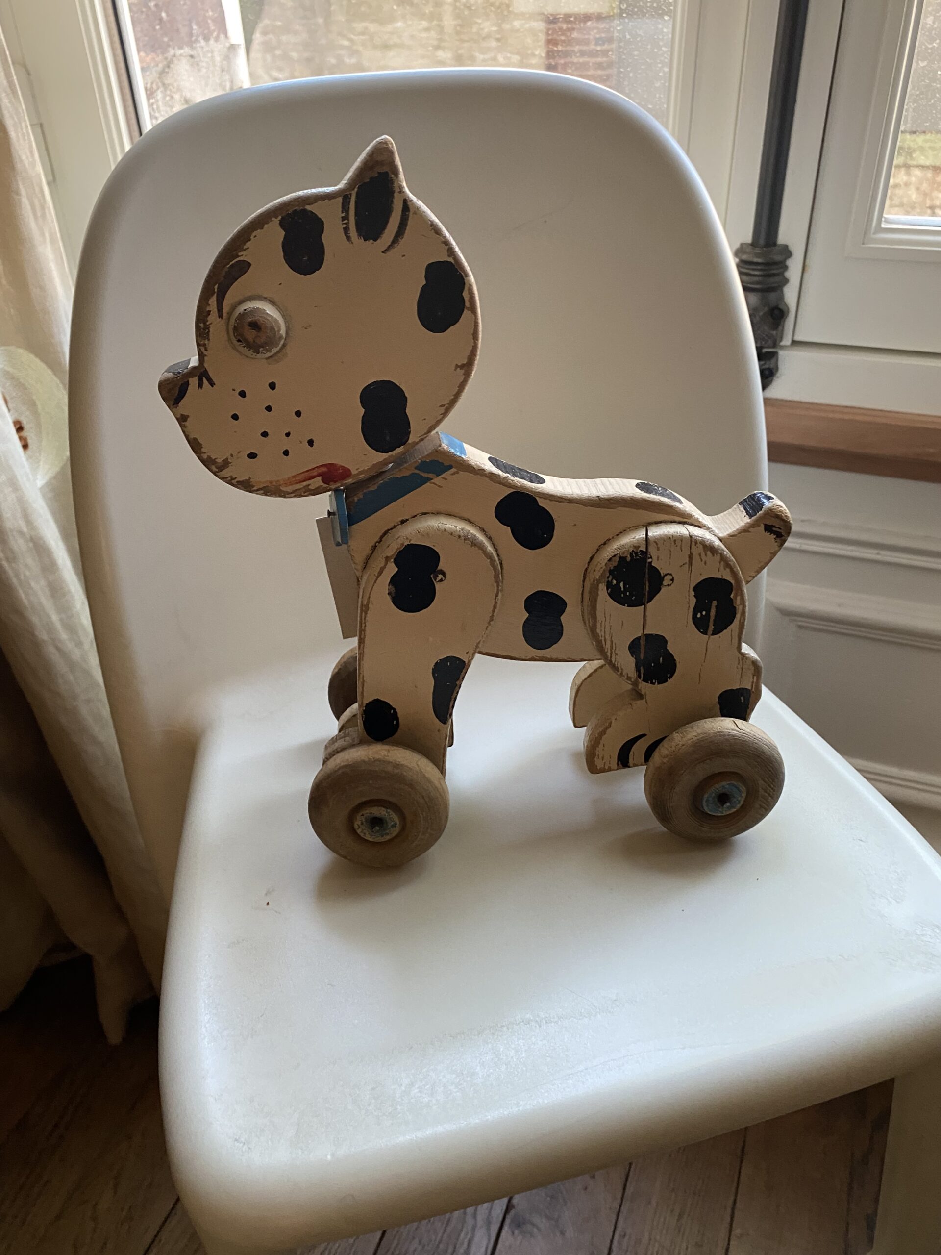 Ce modèle en bois peint est bien conservé. Il possède encore ses roulettes fonctionnelles, sa petite ficelle à tirer et son charme rétro. Grâce à son style naïf, ce chien Pipo apporte une note chaleureuse dans un intérieur. Il peut être posé dans une chambre d’enfant, sur une étagère, ou même dans une vitrine de collection.