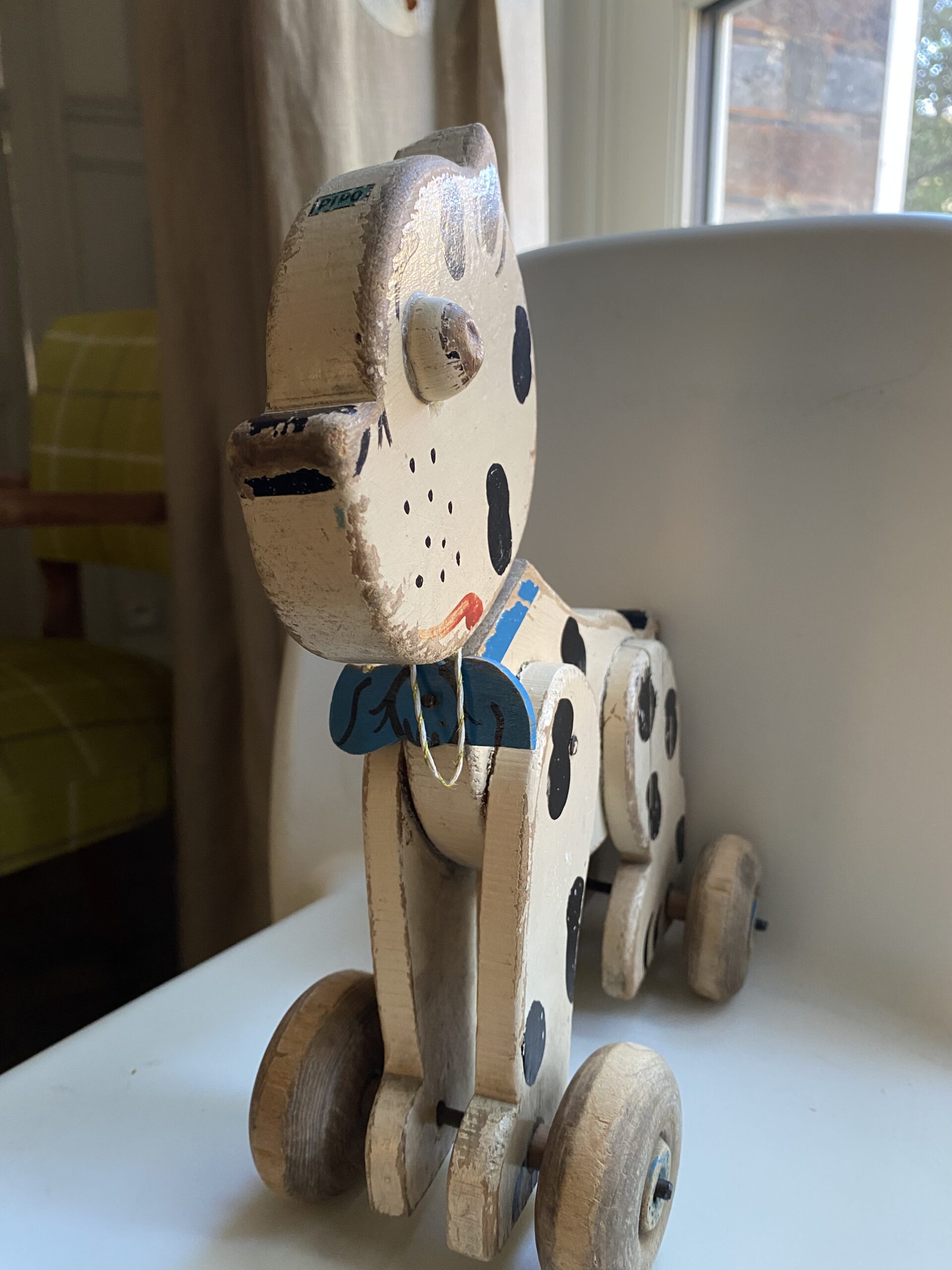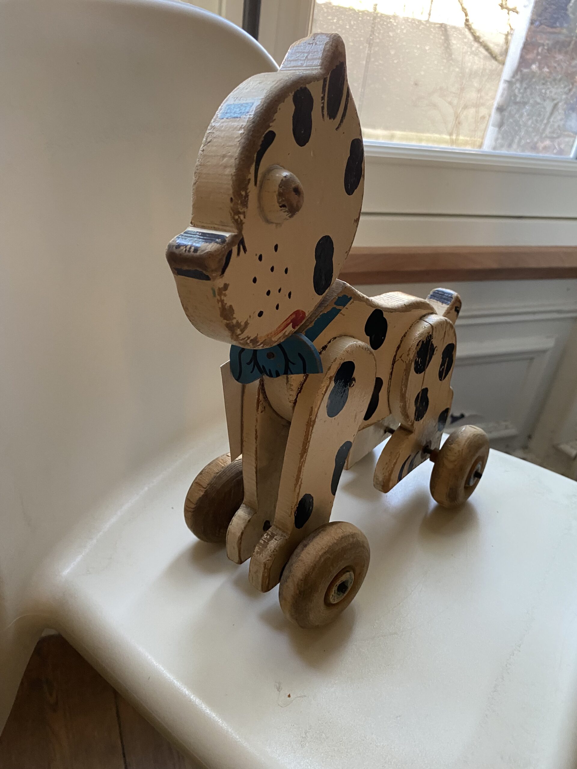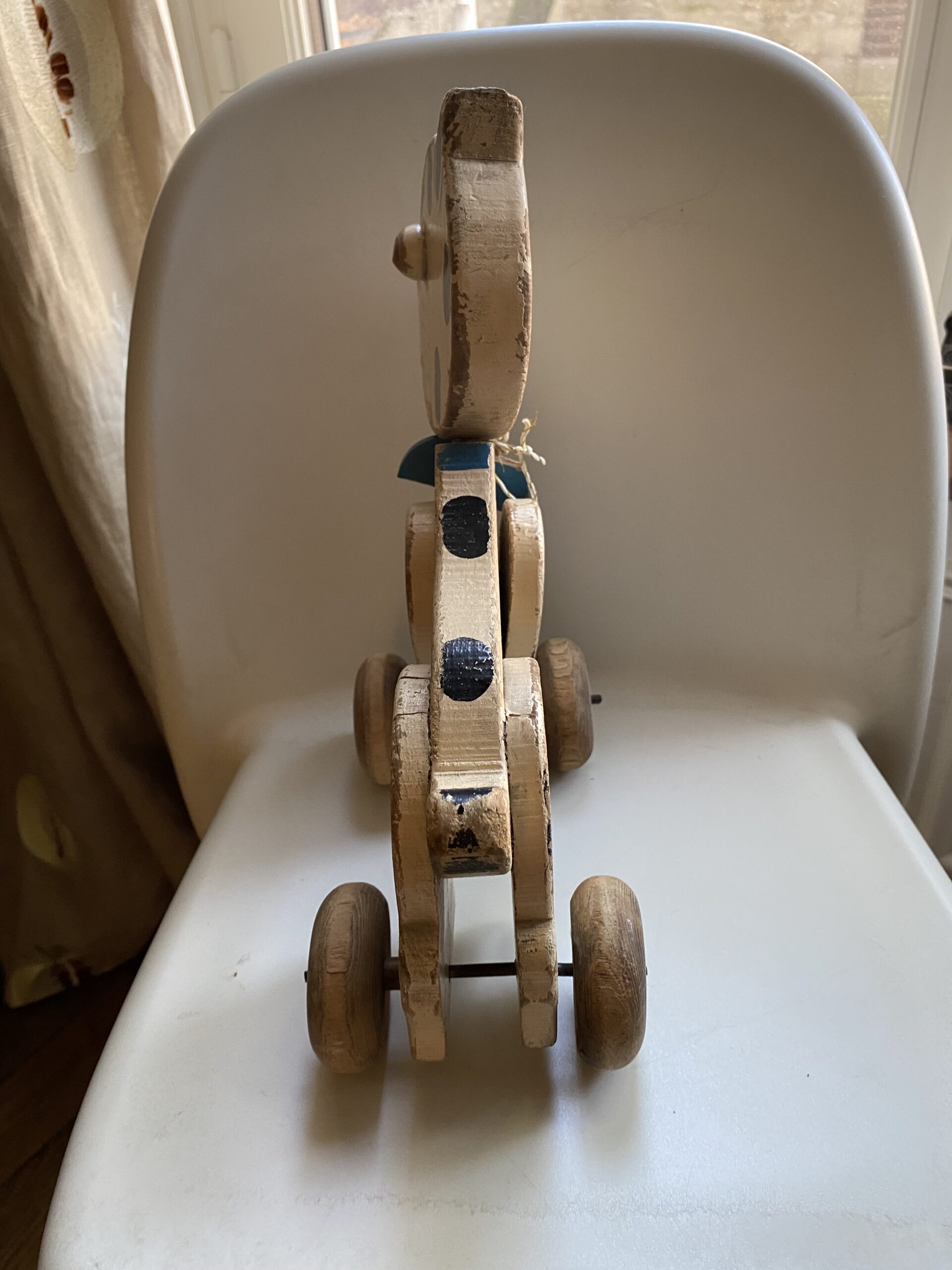 Le chien Pipo bois vintage est un jouet en bois tiré à roulettes, typique des années 50. Avec sa silhouette amusante, ses roues rouges et sa queue qui bouge, il faisait la joie des enfants. Aujourd’hui, il fait partie de ces objets rares et tendres qui racontent une époque.