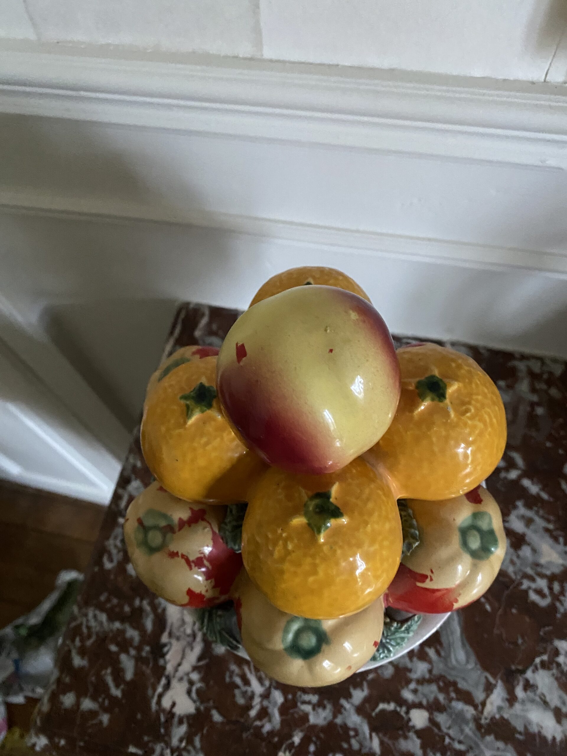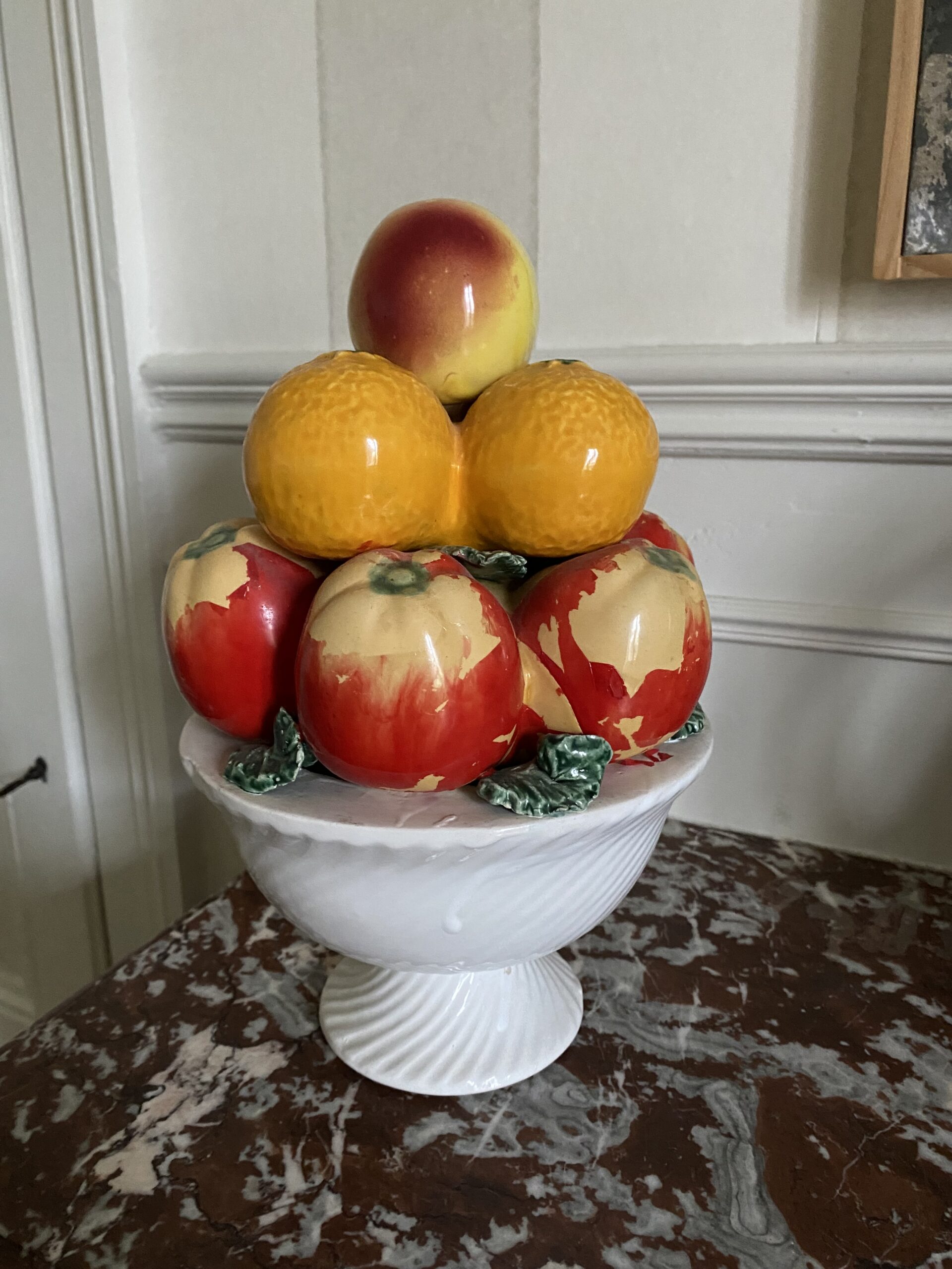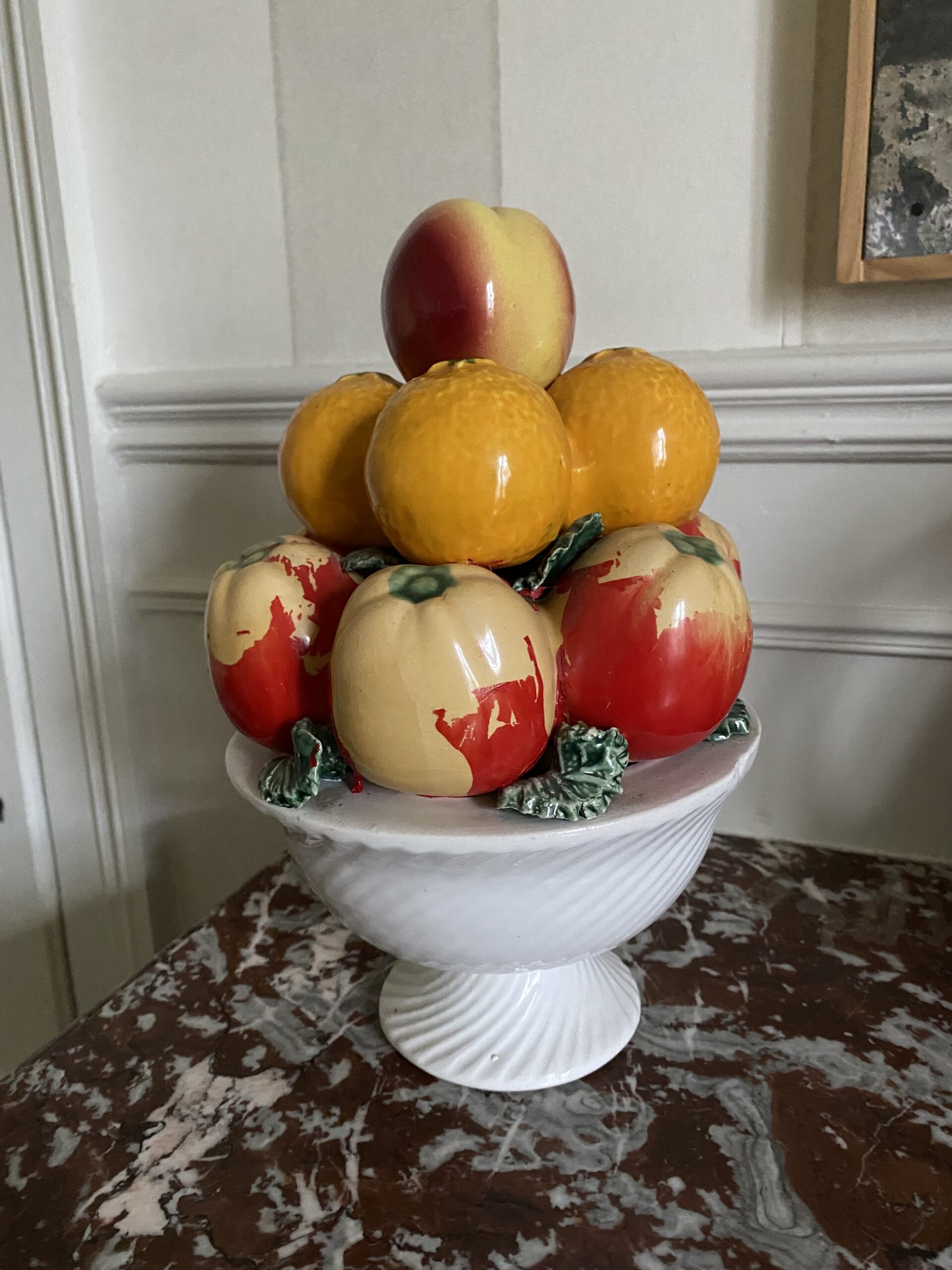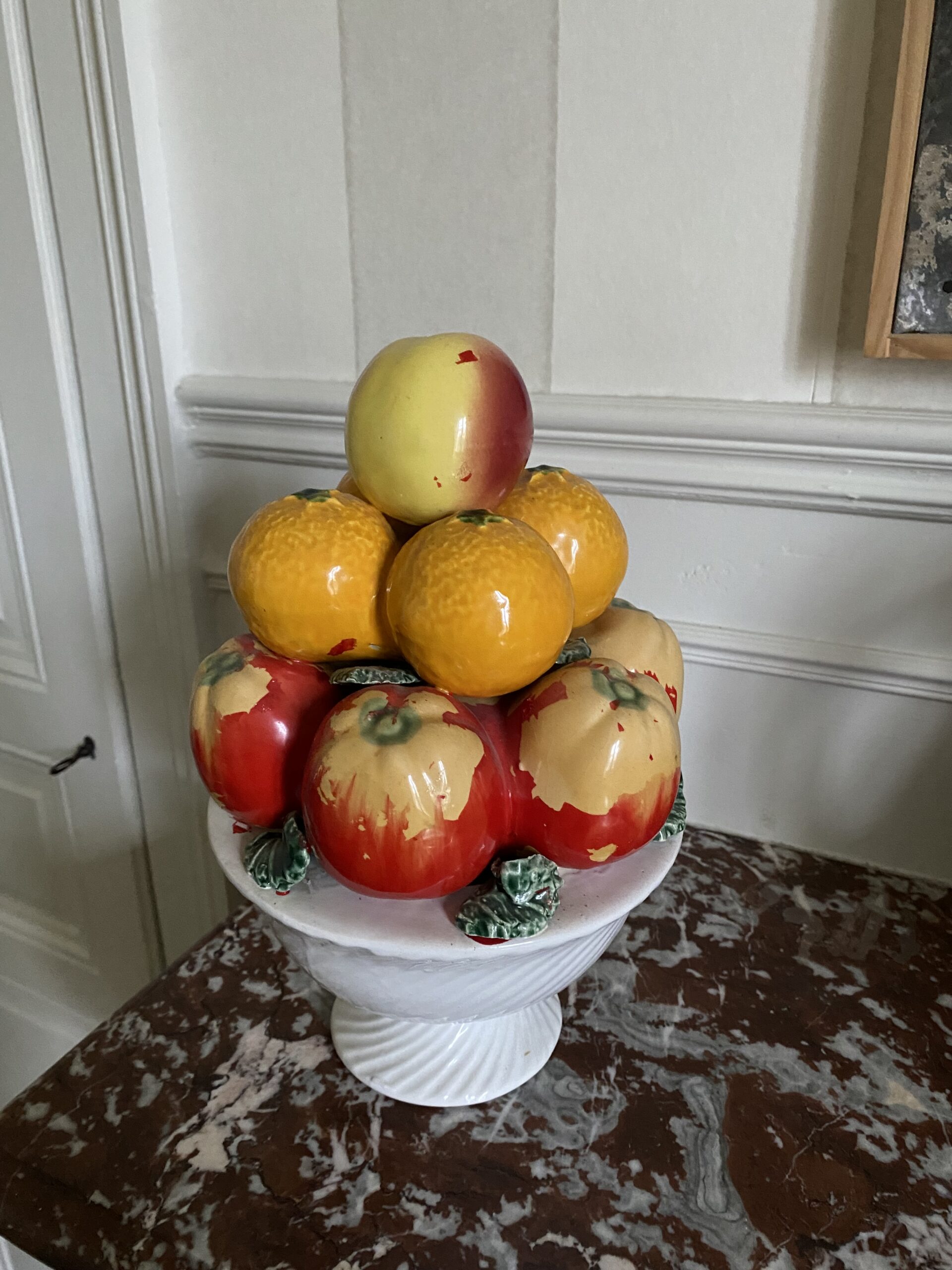 Coupe de fruits en barbotine avec pommes, oranges, pêche, bon état général. Hauteur 30cm, diamètre 20cm environ. Objet vintage avec traces de passé et vécu