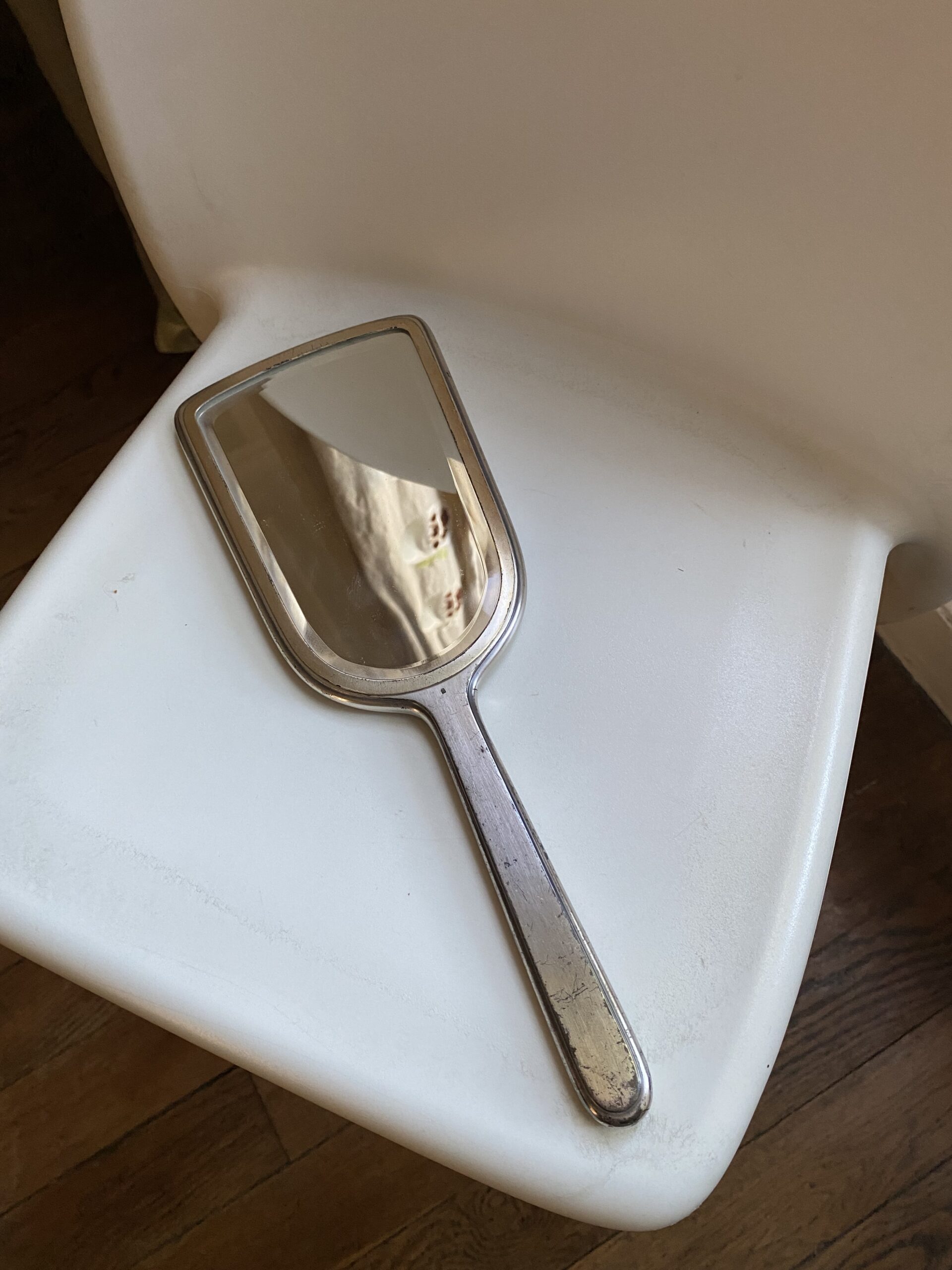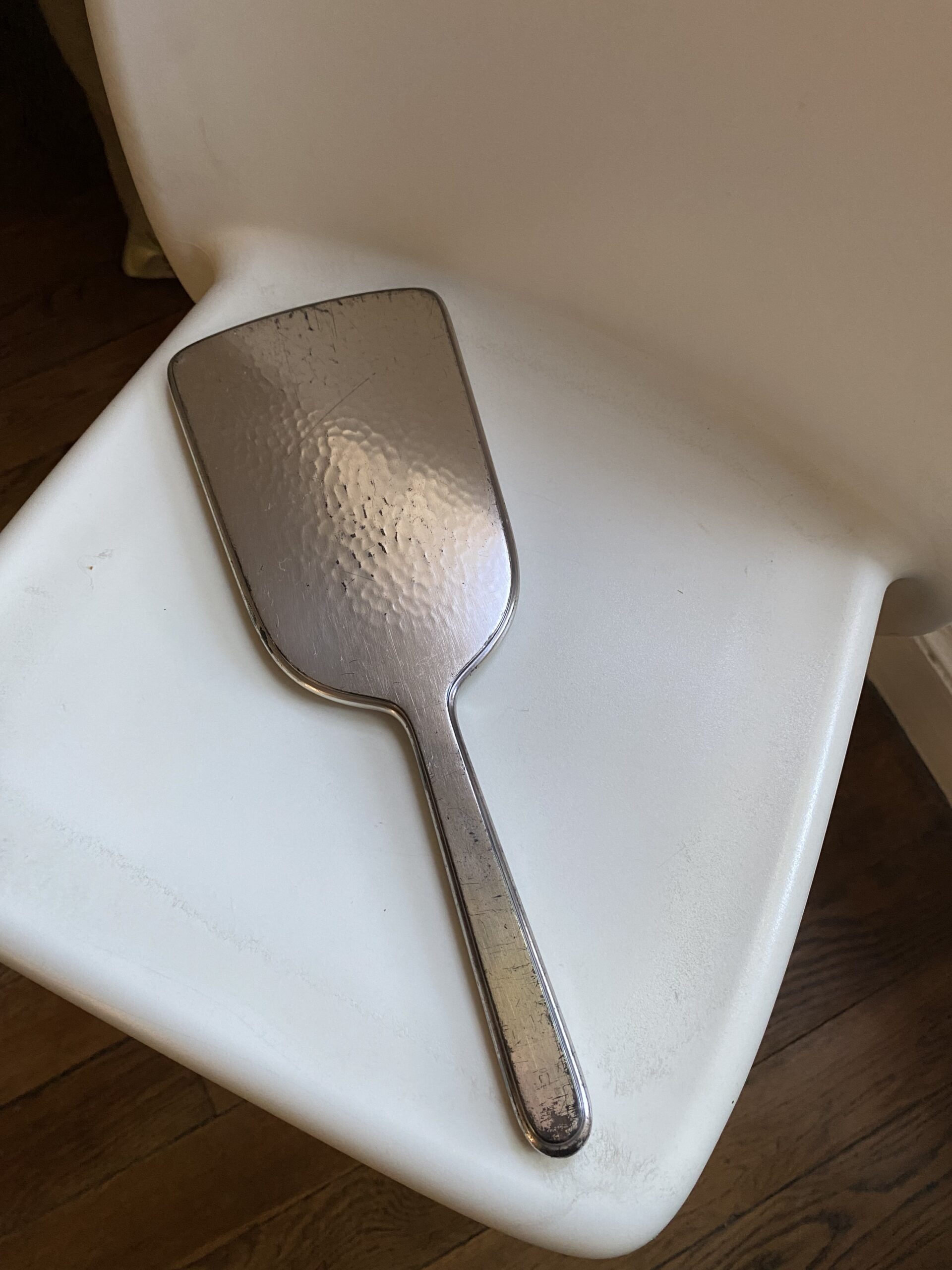 Miroir à main vintage en métal argenté, biseauté, 30x10cm, objet vintage avec traces de passé et vécu