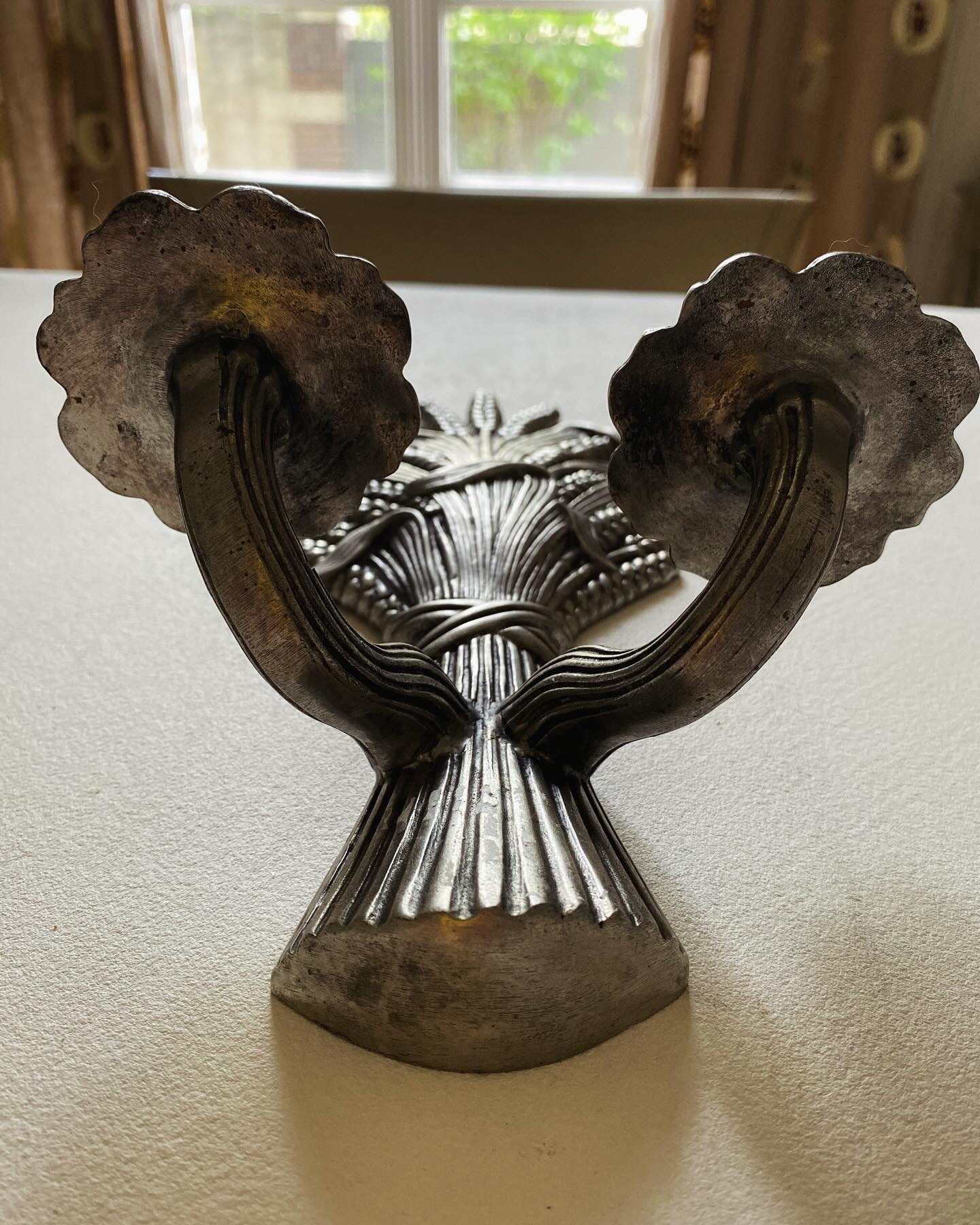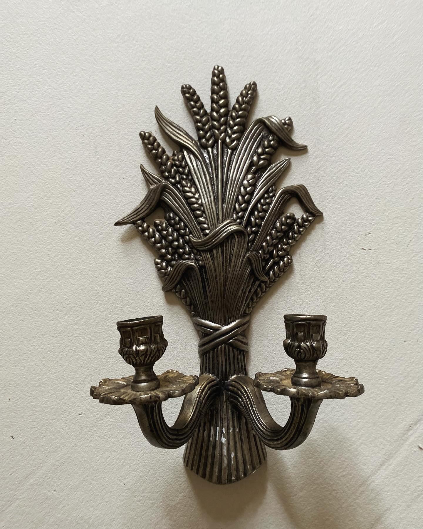 Inspirées du style Louis XVI revisité dans les années 1950-60, ces deux appliques murales en étainreprésentent des gerbes de blé liées par un ruban. Chaque tige semble avoir été cueillie dans un champ d’or et figée dans le temps, évoquant les saisons de moisson et la lumière dorée de fin d’été.