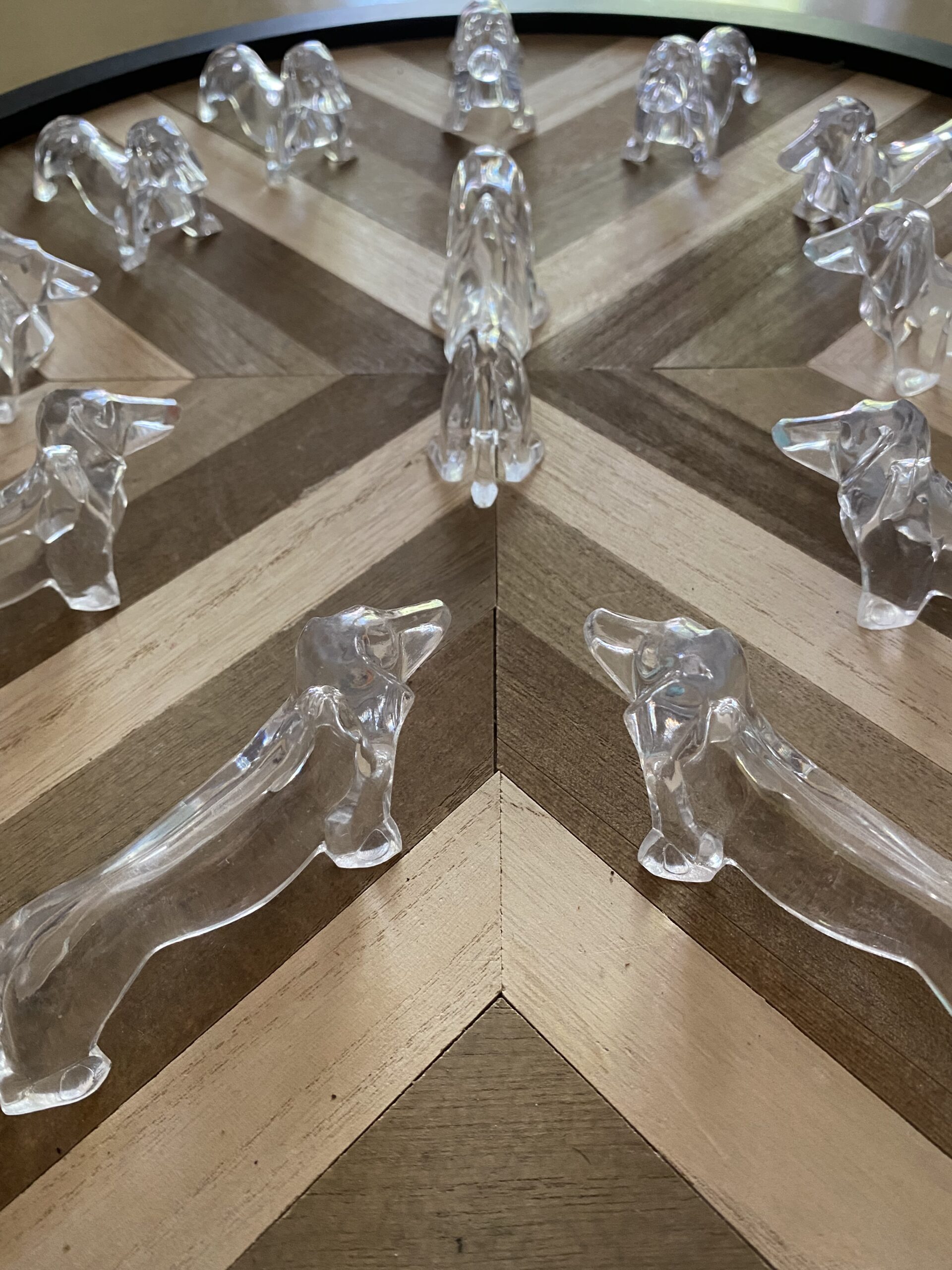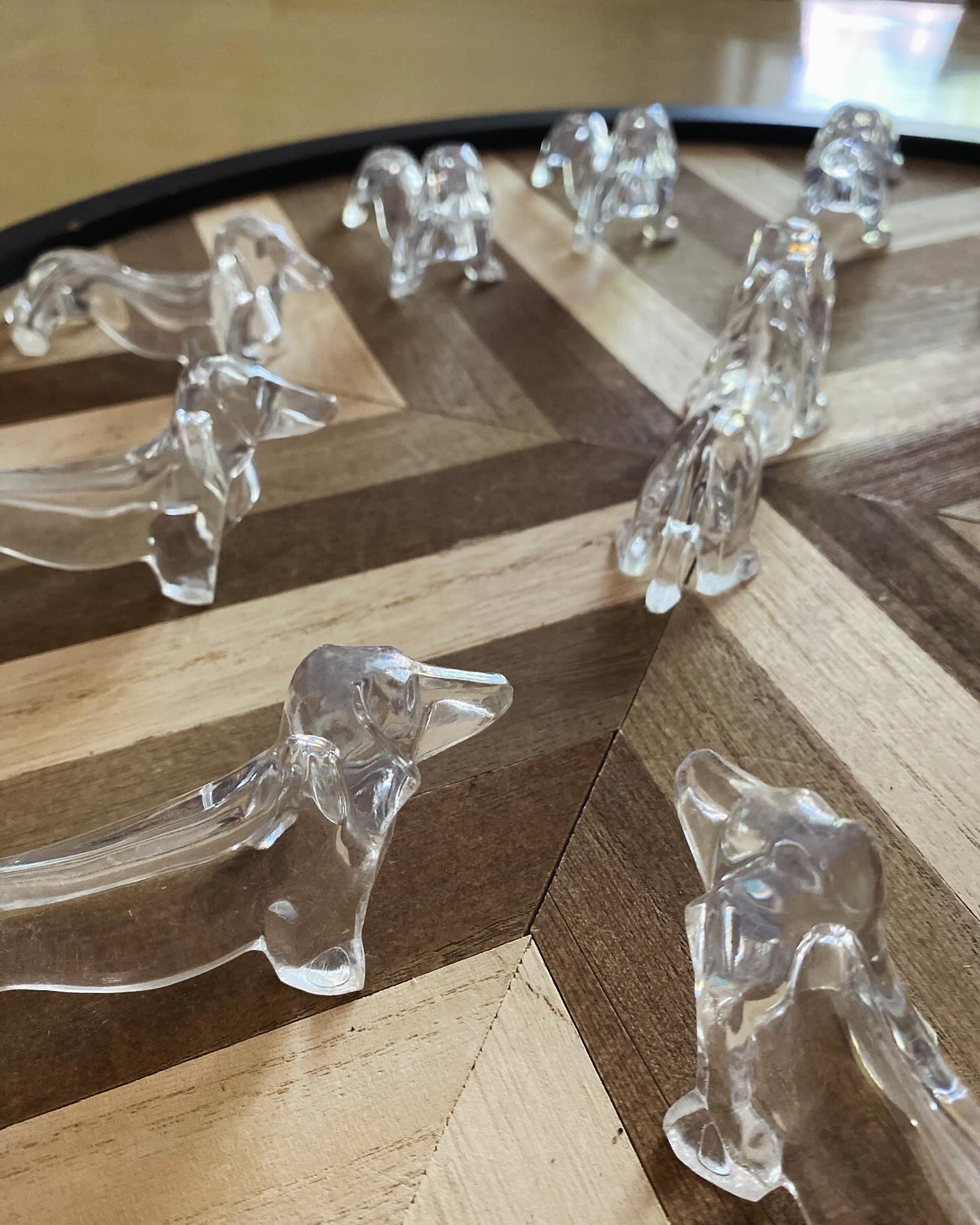12 porte couteaux en état d’usage avec traces de vécu en forme de teckel en Plexiglas translucide années 70