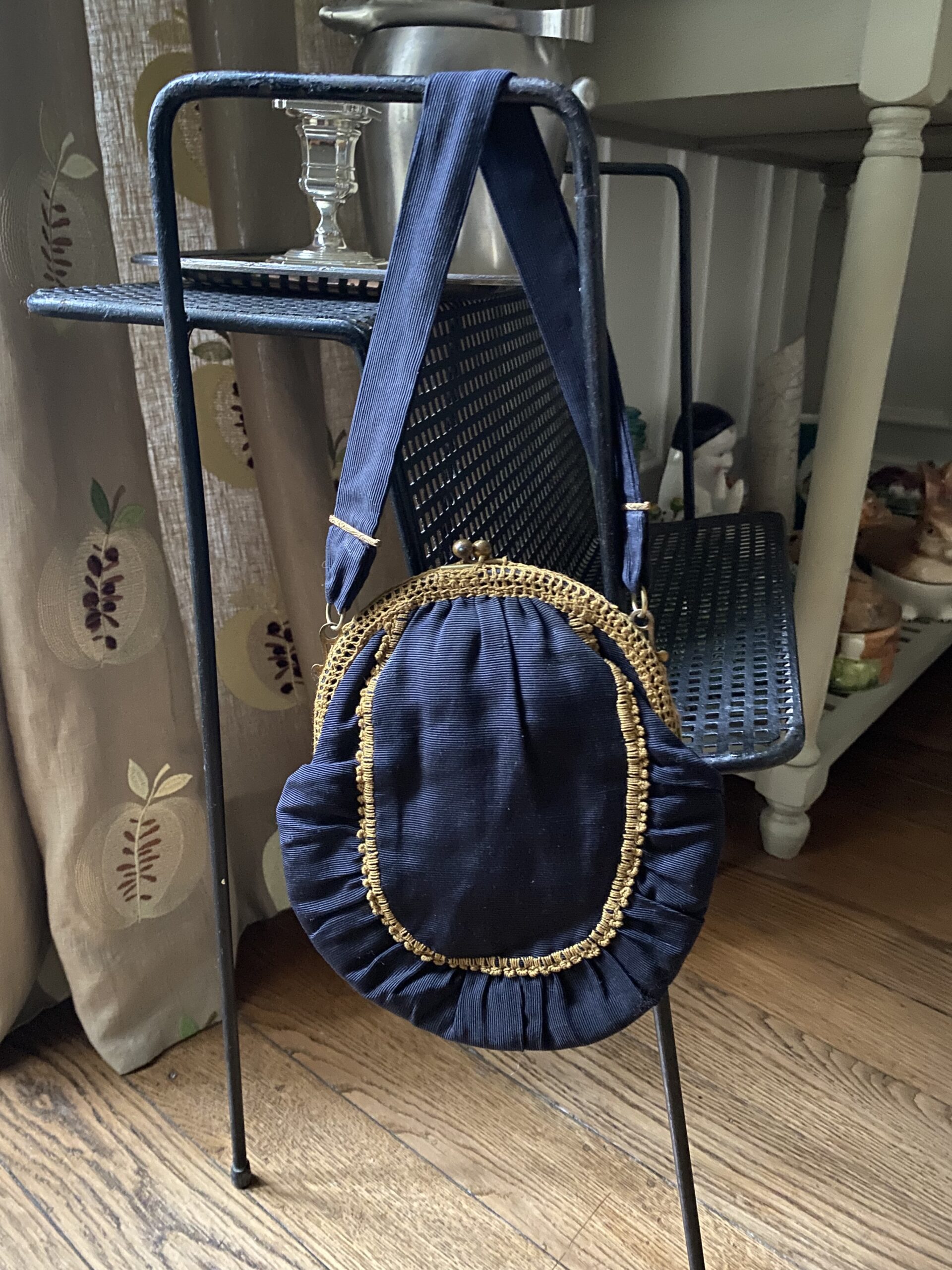 Ce sac à main ancien en soie brodée est une pièce d’exception, à la fois élégante et délicate. Réalisé dans une soie bleu nuit aux reflets subtils, il est orné d’un galon doré brodé à la main qui souligne délicatement sa forme ovale. Un porte-monnaie intégré ainsi qu’un miroir se dissimulent sous son rabat plissé, offrant un espace pratique sans nuire à l’esthétique raffinée de l’ensemble.