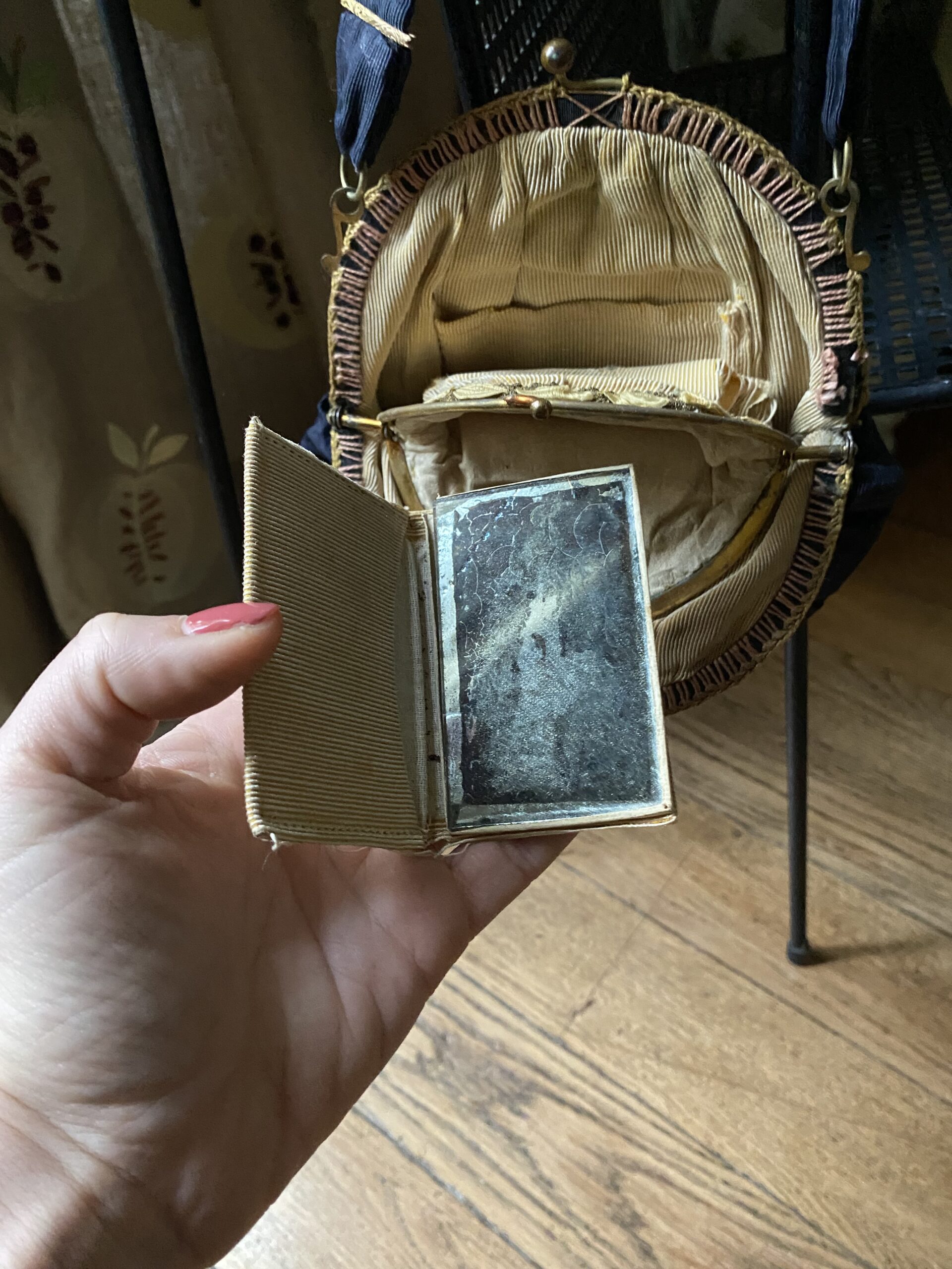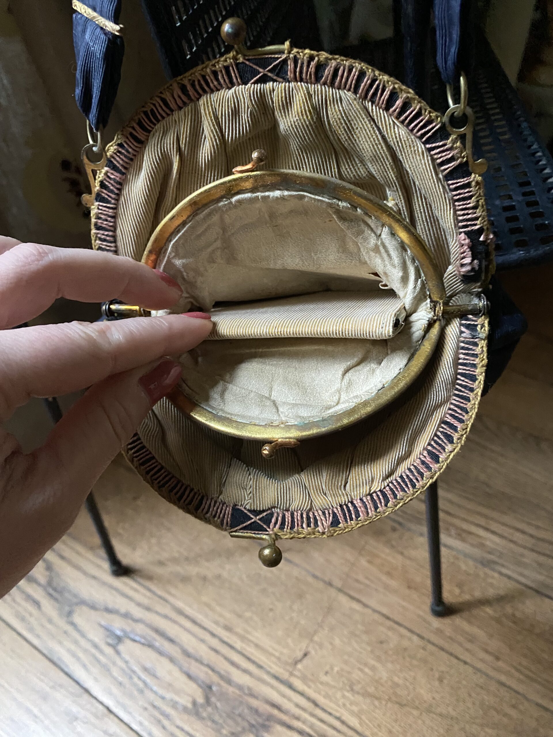 Sac à main broderie ancienne début XXe en trois parties : sac, porte monnaie intégré et miroir de poche, sac 21x17cm. Adorable sac chic et atypique ancien avec traces de passé et vécu