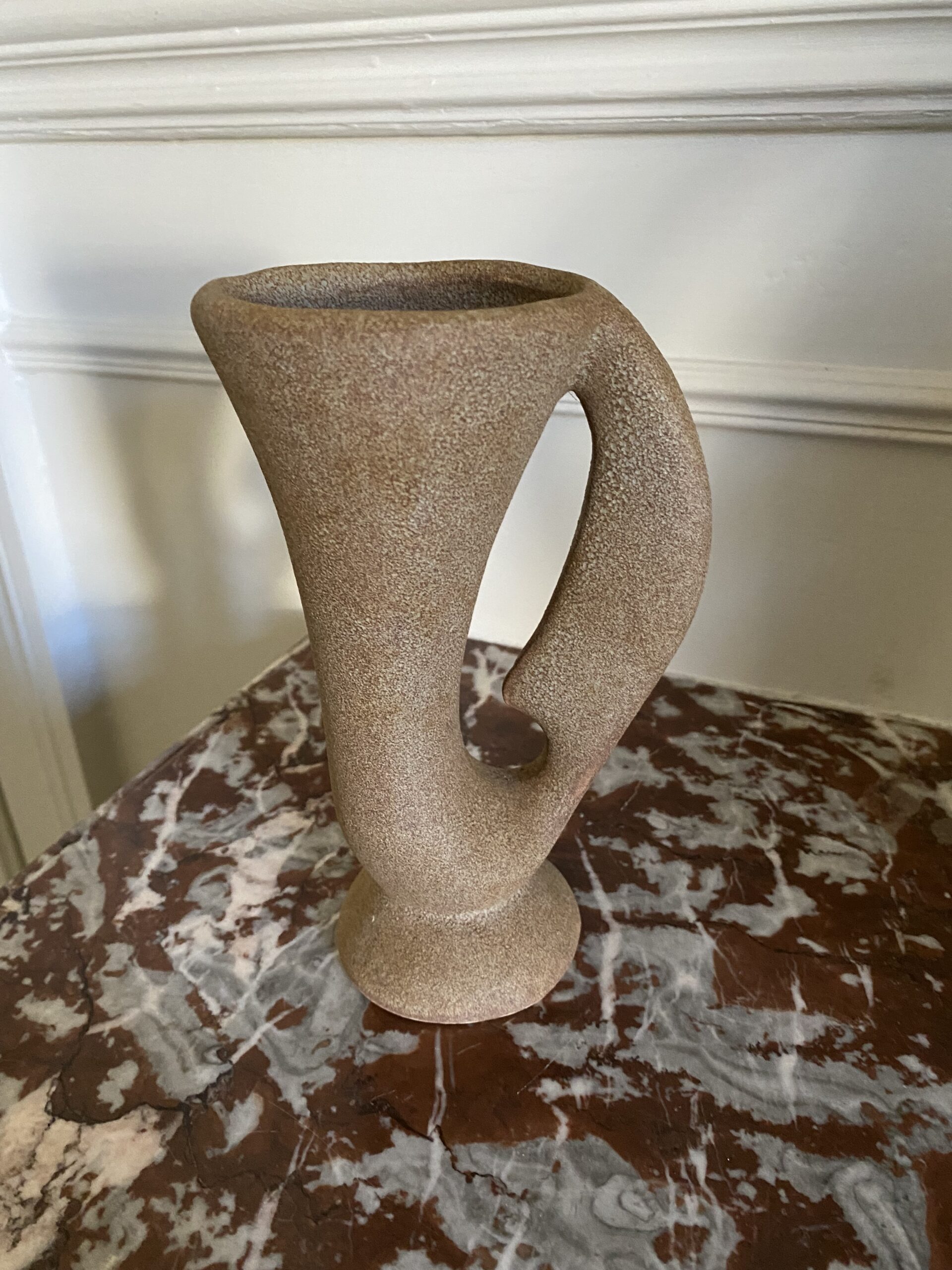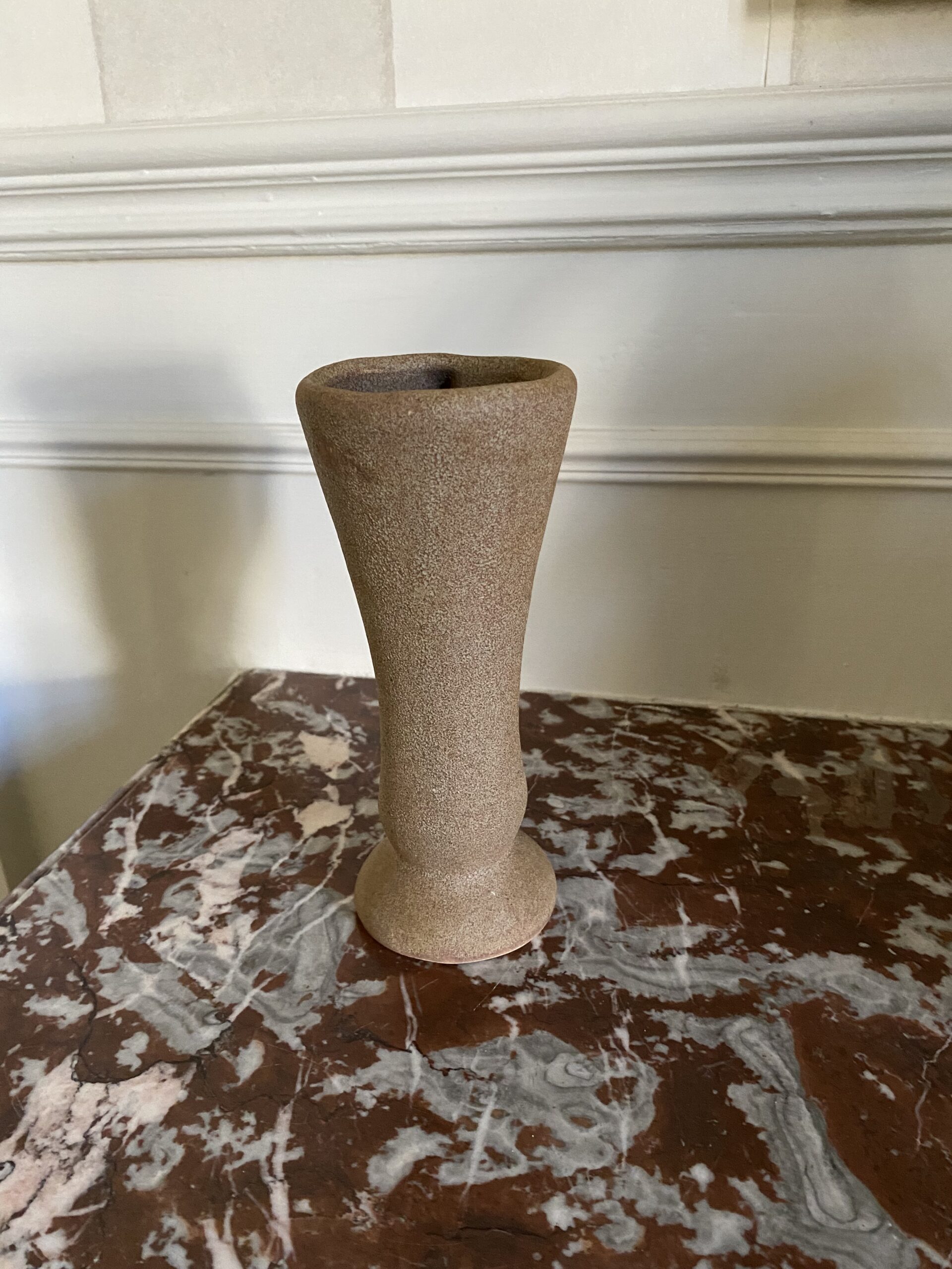 Réalisé en céramique émaillée beige rosé, ce vase attire le regard par ses jeux de relief et sa présence graphique. Il s’intègre parfaitement dans un intérieur aux accents brutalistes, wabi-sabi ou même Art déco, tant son dessin fait le lien entre structure et poésie.